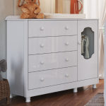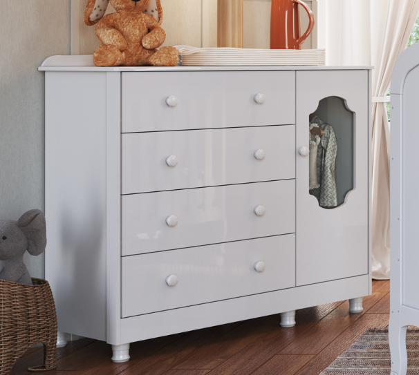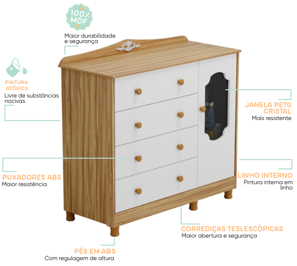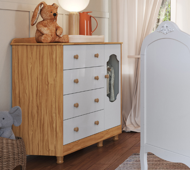 Todos os nossos móveis infantis são fabricados 100% em MDF, um material de alta qualidade que garante maior resistência, estabilidade e acabamento superior. Essa escolha é ideal para o uso diário no quartinho do bebê, pois o MDF não lasca com facilidade, não empena e suporta melhor o uso contínuo, seja ao abrir e fechar gavetas ou apoiar objetos.