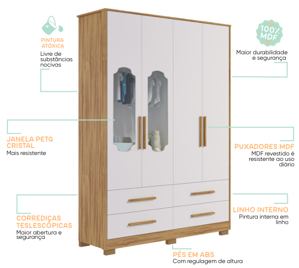 Também é um material sustentável, produzido a partir de madeira reflorestada, contribuindo para a preservação do meio ambiente. Ou seja, nosso móveis oferecem segurança para o bebê, praticidade para os pais e um visual encantador para o quarto. Uma escolha inteligente, bonita e responsável.