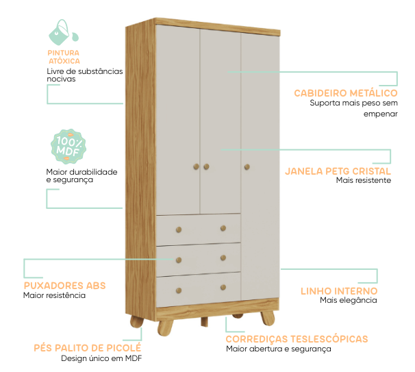 Também é um material sustentável, produzido a partir de madeira reflorestada, contribuindo para a preservação do meio ambiente. Ou seja, nosso móveis oferecem segurança para o bebê, praticidade para os pais e um visual encantador para o quarto. Uma escolha inteligente, bonita e responsável.