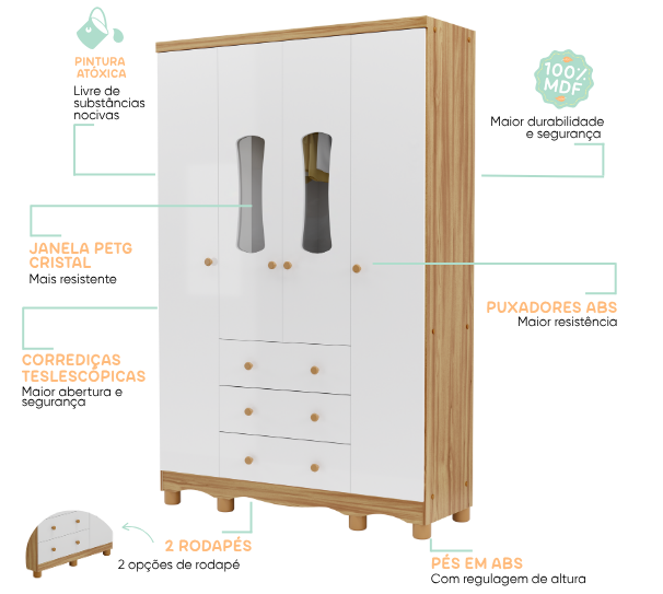 Também é um material sustentável, produzido a partir de madeira reflorestada, contribuindo para a preservação do meio ambiente. Ou seja, nosso móveis oferecem segurança para o bebê, praticidade para os pais e um visual encantador para o quarto. Uma escolha inteligente, bonita e responsável.
