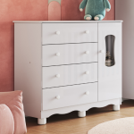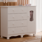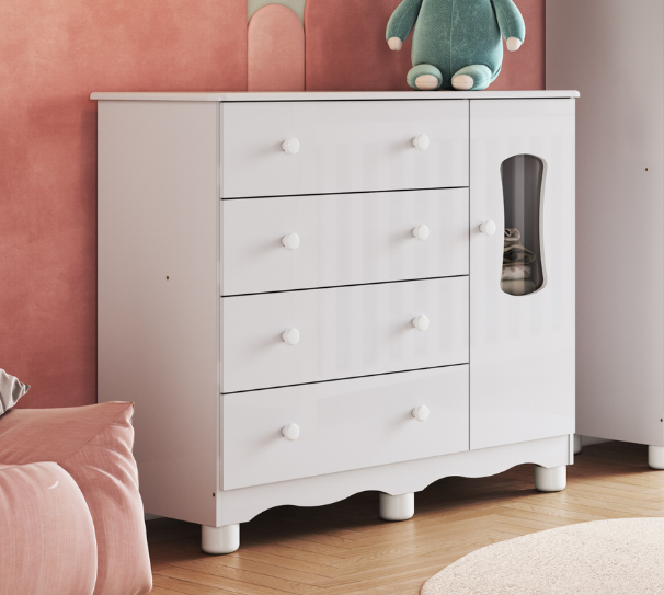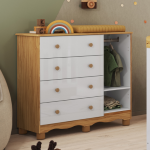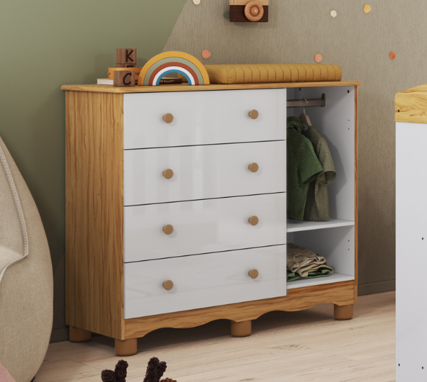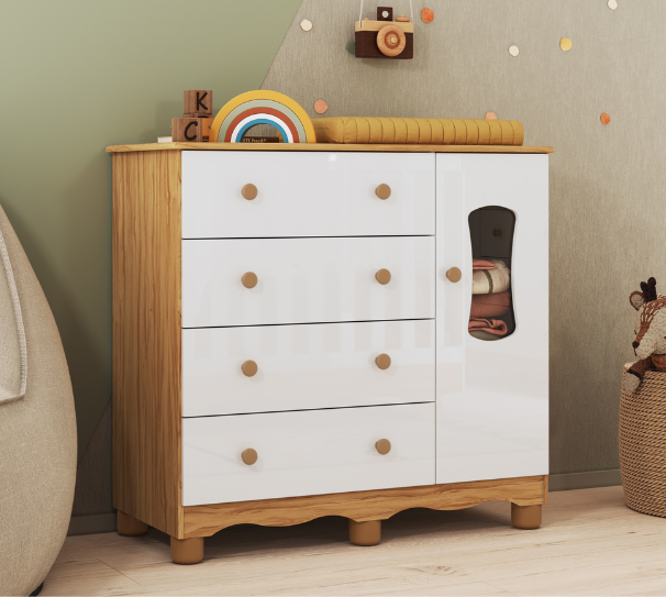 Todos os nossos móveis infantis são fabricados 100% em MDF, um material de alta qualidade que garante maior resistência, estabilidade e acabamento superior. Essa escolha é ideal para o uso diário no quartinho do bebê, pois o MDF não lasca com facilidade, não empena e suporta melhor o uso contínuo, seja ao abrir e fechar gavetas ou apoiar objetos.