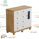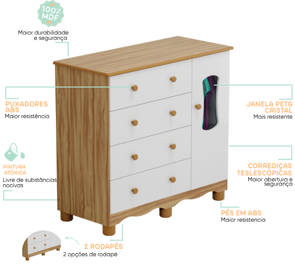 Também é um material sustentável, produzido a partir de madeira reflorestada, contribuindo para a preservação do meio ambiente. Ou seja, nosso móveis oferecem segurança para o bebê, praticidade para os pais e um visual encantador para o quarto. Uma escolha inteligente, bonita e responsável.