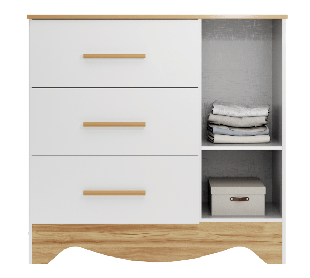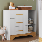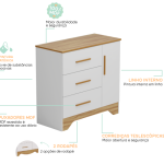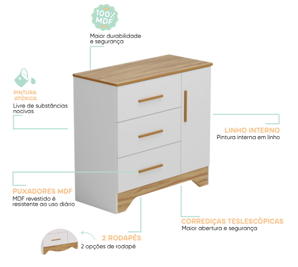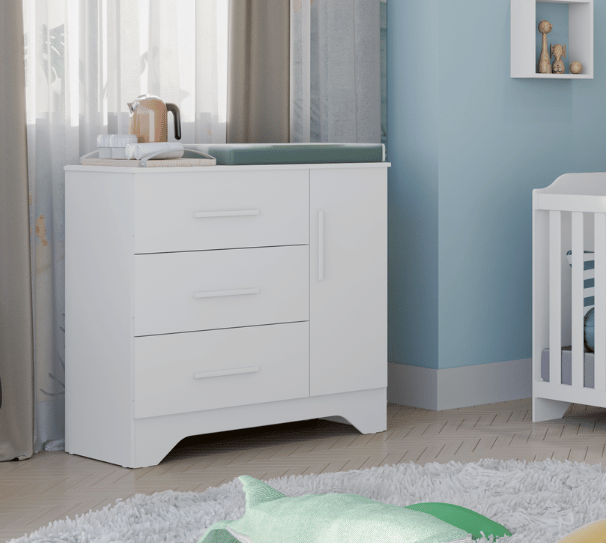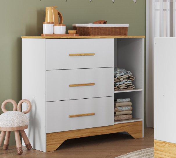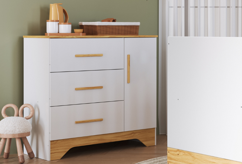 Todos os nossos móveis infantis são fabricados 100% em MDF, um material de alta qualidade que garante maior resistência, estabilidade e acabamento superior. Essa escolha é ideal para o uso diário no quartinho do bebê, pois o MDF não lasca com facilidade, não empena e suporta melhor o uso contínuo, seja ao abrir e fechar gavetas ou apoiar objetos.